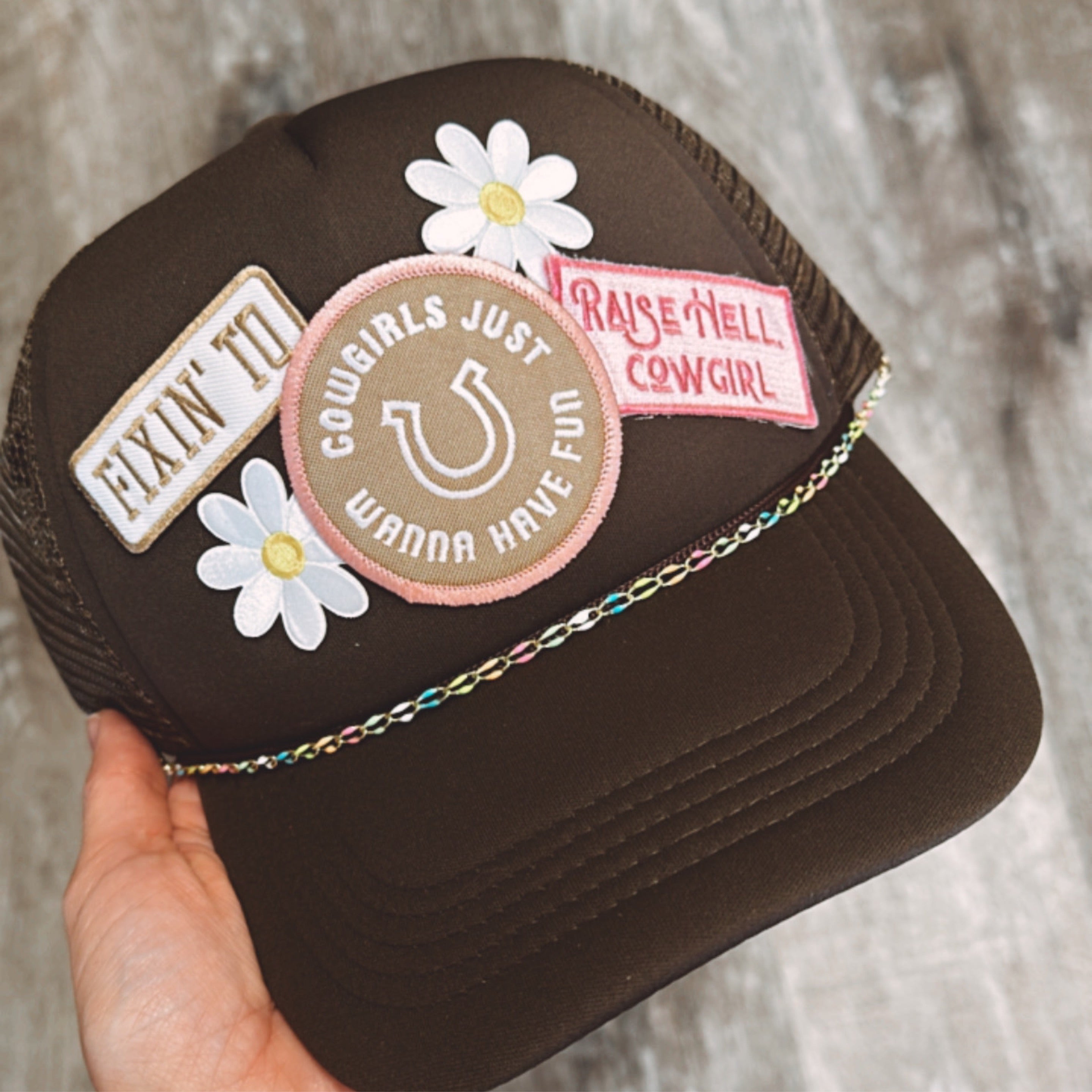 5 Patch Custom trucker hat! Fixin' To - Cowgirls Just Wanna Have Fun - Raise Hell Cowgirl